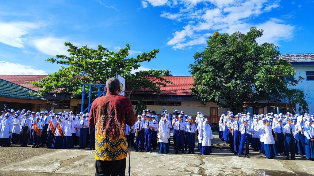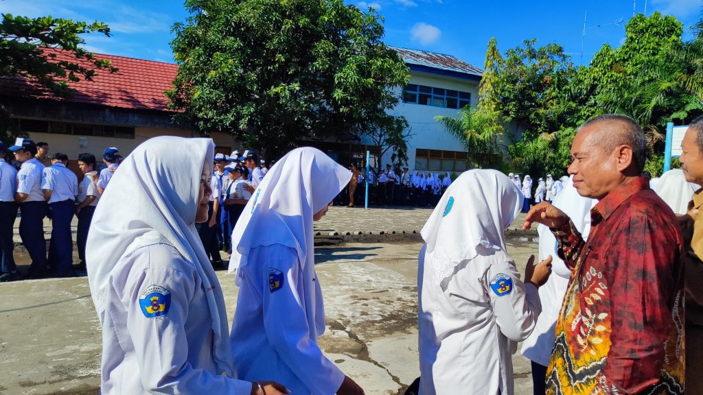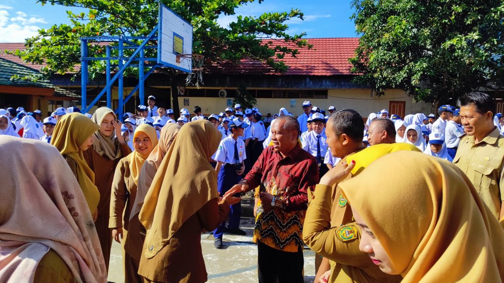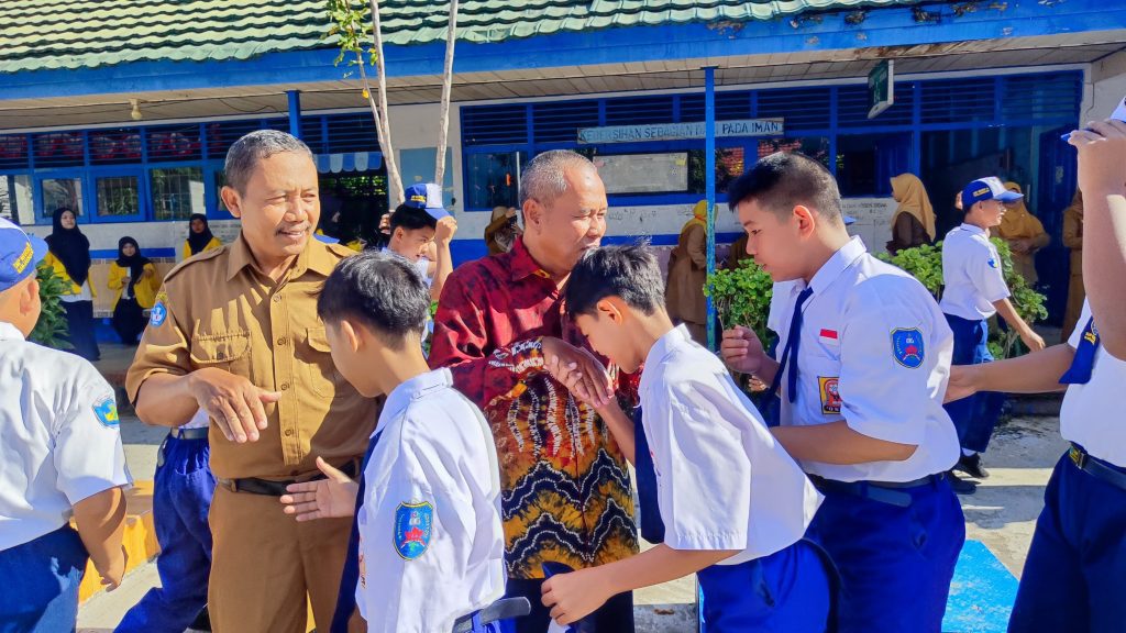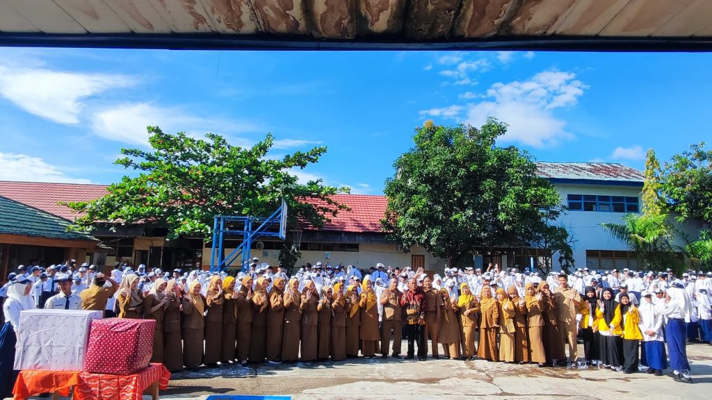Kebersamaan siswa-siswi, guru serta staf sekolah bersalaman dan menyerahan tanda kenang-kenangan kepada Guru yang telah Purna Tugas Bapak Drs. Agus Herman (Guru IPA).
